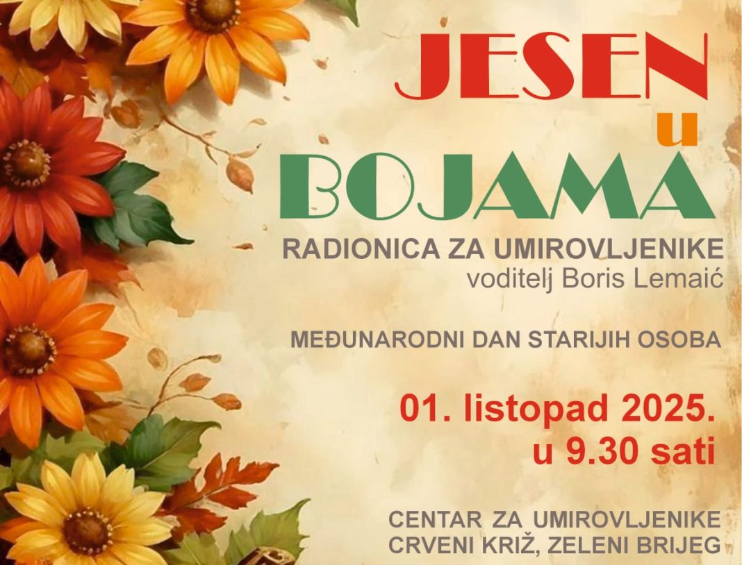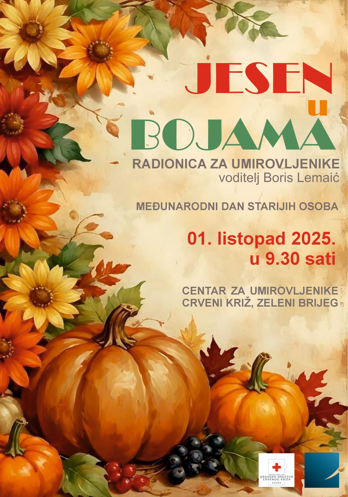 Crveni križ Sisak u suradnji s Domom kulture Kristalna kocka vedrine, Gradsko kazalište Sisak organizira radionicu izrade cvjetnih aranžmana “Jesen u bojama” i poziva sve zainteresirane osobe starije životne dobi da se pridruže u srijedu, 1. listopada od 9,30 do 11,00 sati u Dnevnom centru za umirovljenike Zeleni brijeg (Kršinićeva ulica 19, Sisak) povodom obilježavanja Međunarodnog dana starijih osoba.