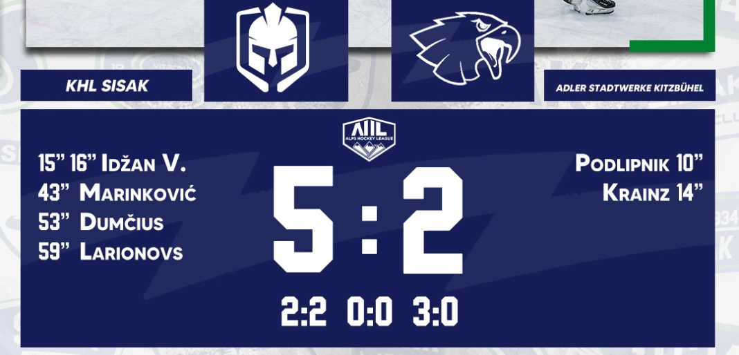 Druga trećina nije donijela ni jedan pogodak, a onda je na startu posljednjeg perioda Karlo Marinković zabio za prvo vodstvo Siska na utakmici – 3:2. Tu prednost su i povećali do kraja pogocima Marijusa Dumčijusa i Danile Larionovsa te su sa 5:2 došli do šeste pobjede u sedam odigranih utakmica. Tako su Vitezovi i dalje na vrhu Alpske lige. Imaju 17 bodova, a prvi pratitelj im je Gardena koja im je zadala jedini poraz ove sezone.