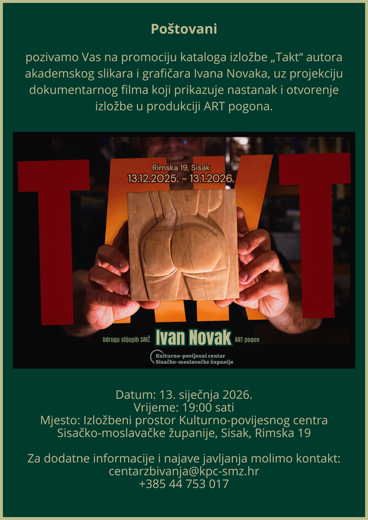 U Galeriji Kulturno-povijesnog centra Sisačko-moslavačke županije, koja se nalazi na adresi Rimska 19 u Sisku, održat će se promocija kataloga izložbe “Takt” autora akademskog slikara i grafičara Ivana Novaka. Ovaj događaj zakazan je za utorak, 13. siječnja 2026. godine, s početkom u 19:00 sati.
