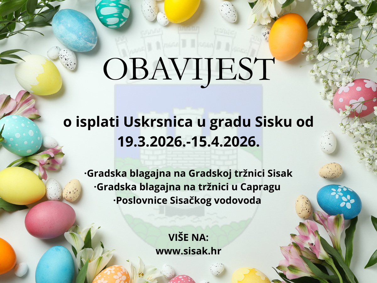 Grad Sisak i ove godine nastavlja s isplatom Uskrsnica kao dio kontinuirane podrške svojim sugrađanima, vodeći računa o standardu umirovljenika, korisnika nacionalne naknade te osoba koje skrbe o članovima svojih obitelji.