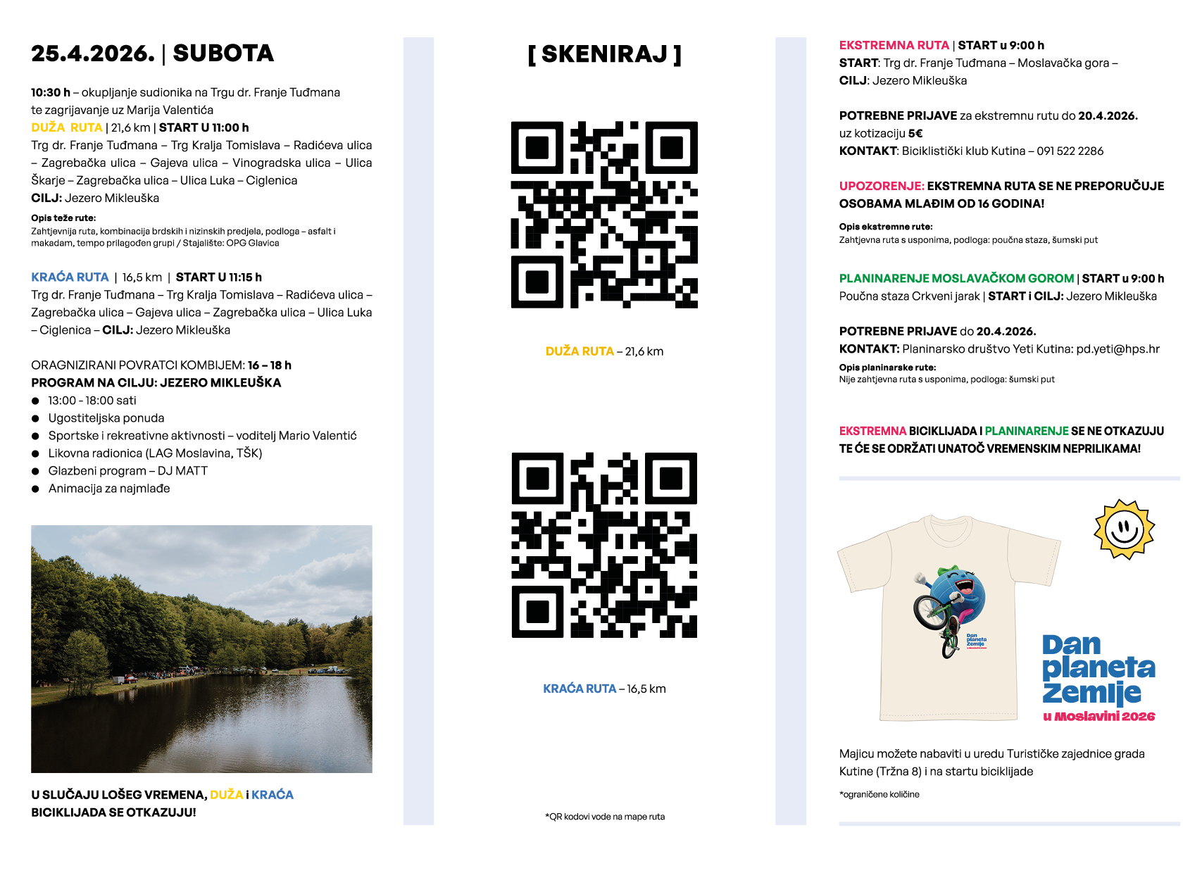 Planinarenje počinje u 9 sati na jezeru Mikleuška, a sastoji se od manje zahtjevne rute s usponima i podlogom šumskog puta. Planinarenje će prolaziti poučnom stazom „Crkveni jarak“ do arheološkog nalazišta Samostan Blažene Djevice Marije (Bela Crkva), najvišeg vrha Moslavačke gore – Humke, vidikovca Vis na kojem se pruža predivan pogled na moslavački kraj s krajnjim ciljem na jezeru Mikleuška. Obavezne prijave na pd.yeti@hps.hr (Planinarsko društvo Yeti Kutina). Cilj svih ruta biciklijade i planinarenja je na jezeru Mikleuška u Regionalnom parku Moslavačka gora.