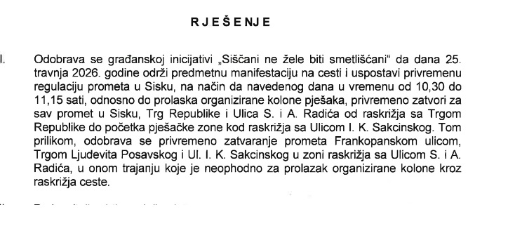 Zbog prosvjedne povorke u subotu, 25. travnja, bit će privremeno zatvoren promet u središtu Siska.